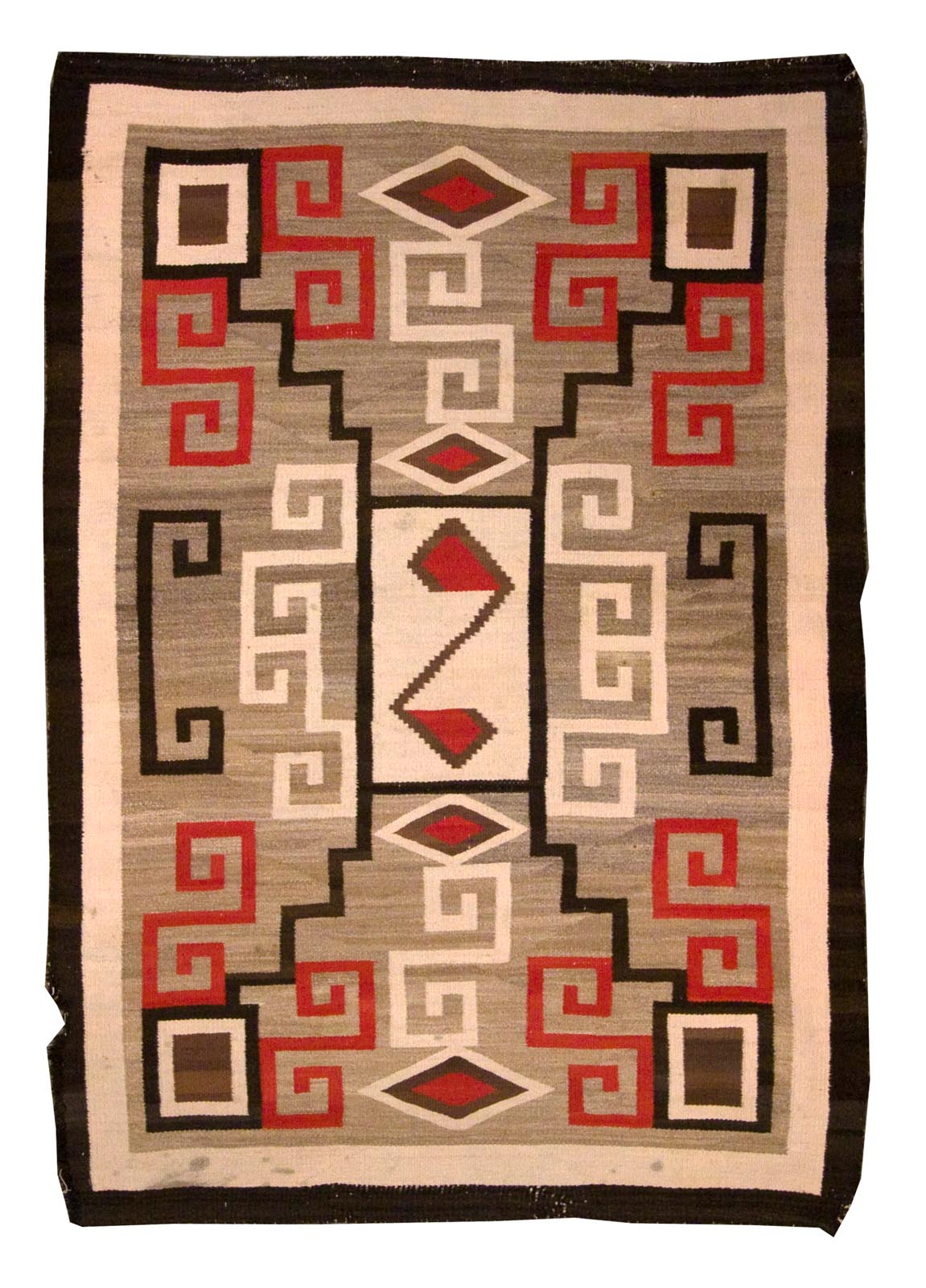 DESCRIPTION: The Native American Crystal rug originates from the Navajo weaving tradition and is named after the Crystal Trading Post in New Mexico. These rugs are known for their balanced geometric patterns, often featuring diamonds, stepped motifs, and muted earth tones like gray, brown, and ivory. Woven with hand-dyed wool, Crystal rugs reflect both the artistry and resourcefulness of Navajo weavers, blending traditional symbolism with regional influences.
