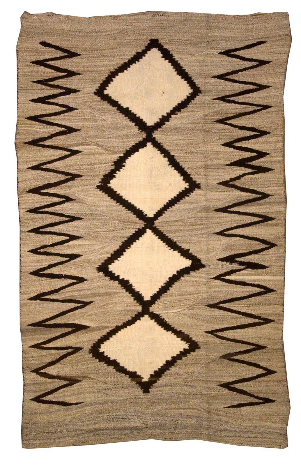 DESCRIPTION: Two Grey Hills Navajo rugs are renowned for their fine handspun wool, tight weave, and elegant use of natural, undyed colors. These rugs often feature complex diamond-based patterns set within stepped and geometric borders, all in a subtle palette of browns, grays, ivory, and black. Reflecting masterful craftsmanship from the Two Grey Hills region, they are celebrated for their balance, precision, and understated beauty.