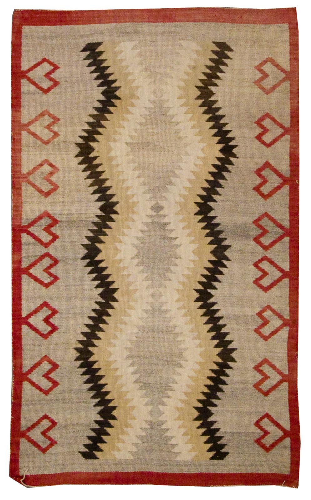 DESCRIPTION: Klagetoh Navajo rugs are closely related to the Ganado style but distinguished by their gray or taupe background, which sets off bold central diamond motifs in red, black, and white. These rugs feature strong geometric symmetry and often include stepped or hooked borders that frame the central design. Woven with handspun wool and exceptional balance, Klagetoh rugs reflect the skilled artistry and regional identity of the Klagetoh weaving tradition.