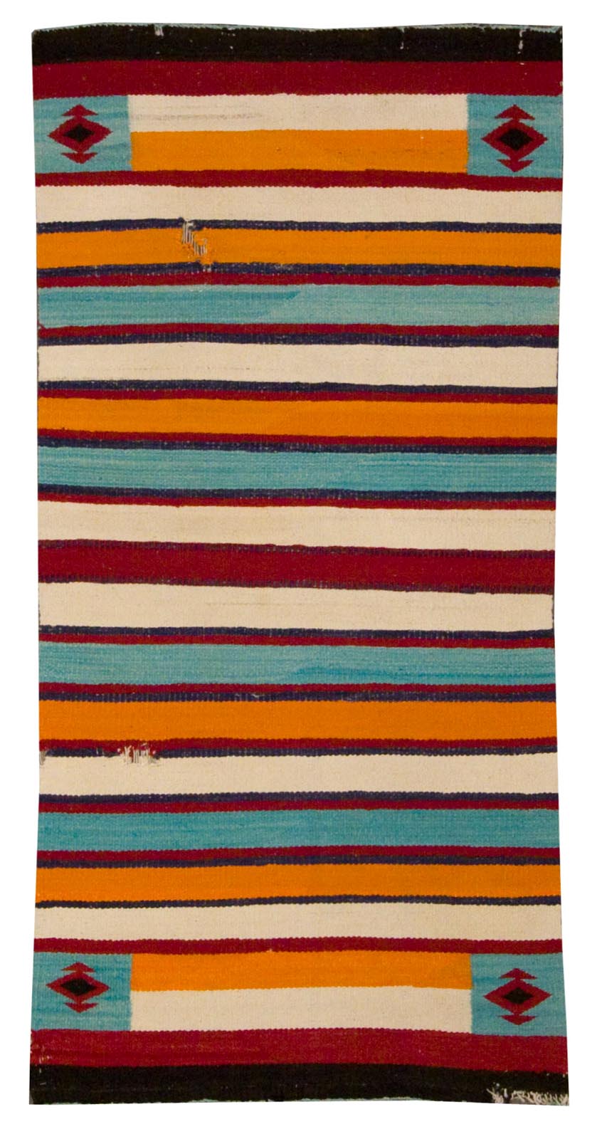 DESCRIPTION: A Navajo Double Saddle Blanket is a sturdy, thick textile originally woven to be folded and used under a saddle for extra cushioning and durability. These blankets often feature bold, balanced designs, such as stripes, crosses, or diamonds, woven in vibrant colors like red, black, white, and indigo. Valued today for their graphic appeal and historical function, double saddle blankets showcase both the practicality and artistry of Navajo weaving.