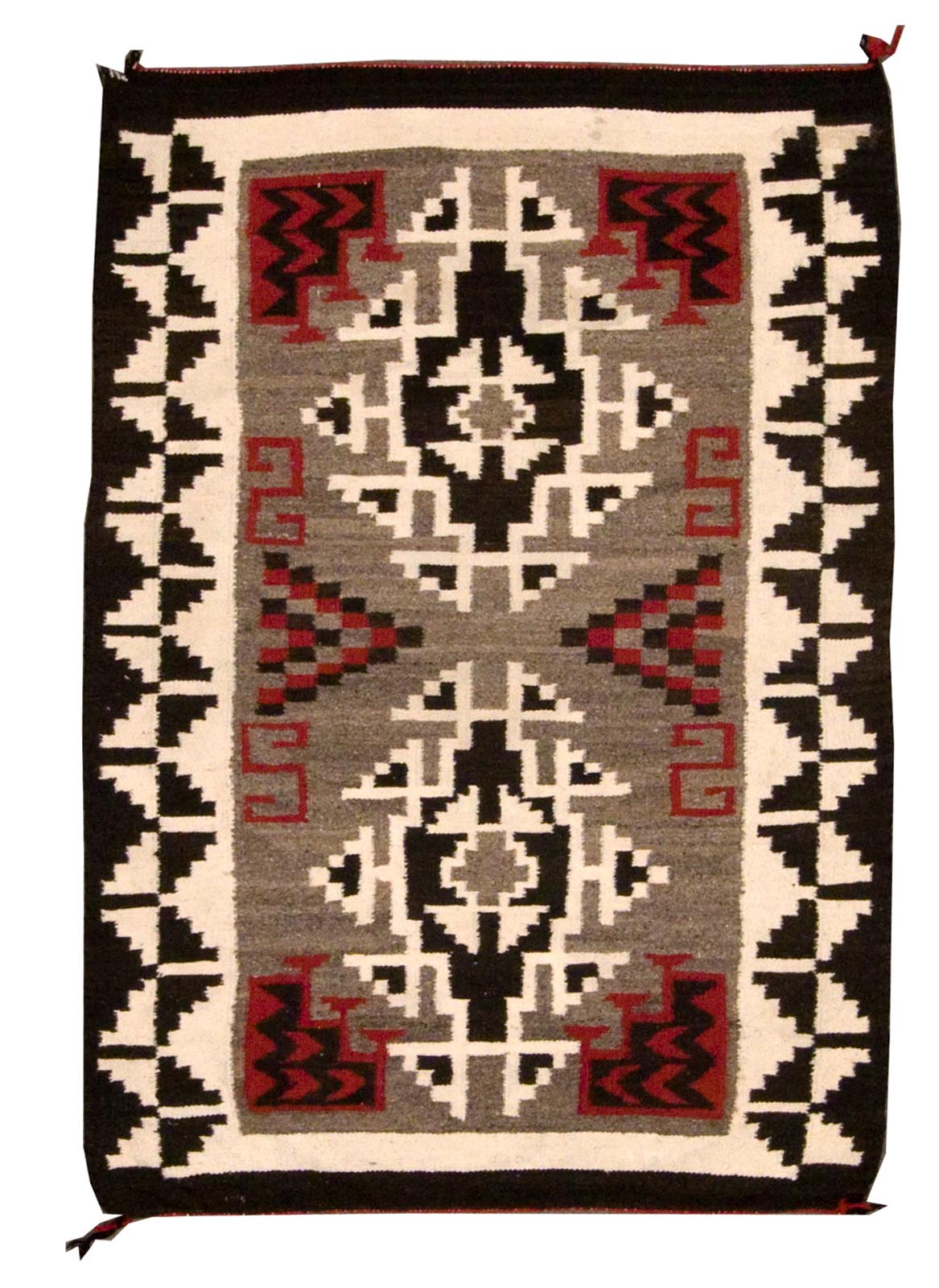 DESCRIPTION: Klagetoh Navajo rugs are closely related to the Ganado style but distinguished by their gray or taupe background, which sets off bold central diamond motifs in red, black, and white. These rugs feature strong geometric symmetry and often include stepped or hooked borders that frame the central design. Woven with handspun wool and exceptional balance, Klagetoh rugs reflect the skilled artistry and regional identity of the Klagetoh weaving tradition.