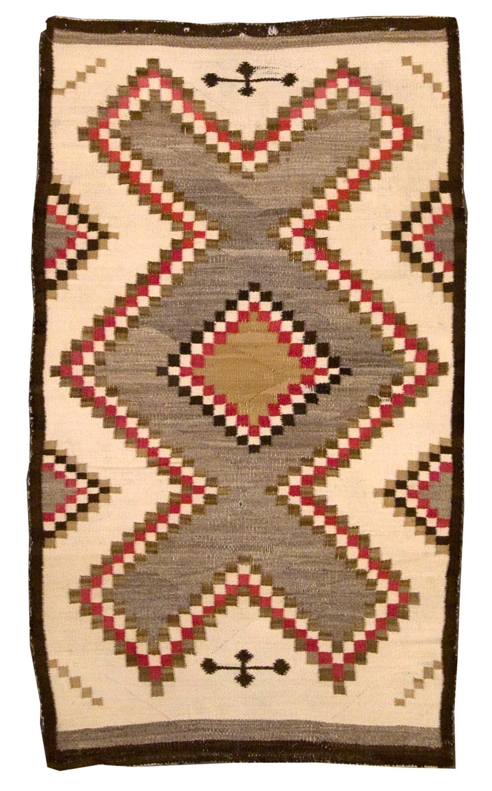 DESCRIPTION: The Native American Crystal rug originates from the Navajo weaving tradition and is named after the Crystal Trading Post in New Mexico. These rugs are known for their balanced geometric patterns, often featuring diamonds, stepped motifs, and muted earth tones like gray, brown, and ivory. Woven with hand-dyed wool, Crystal rugs reflect both the artistry and resourcefulness of Navajo weavers, blending traditional symbolism with regional influences.