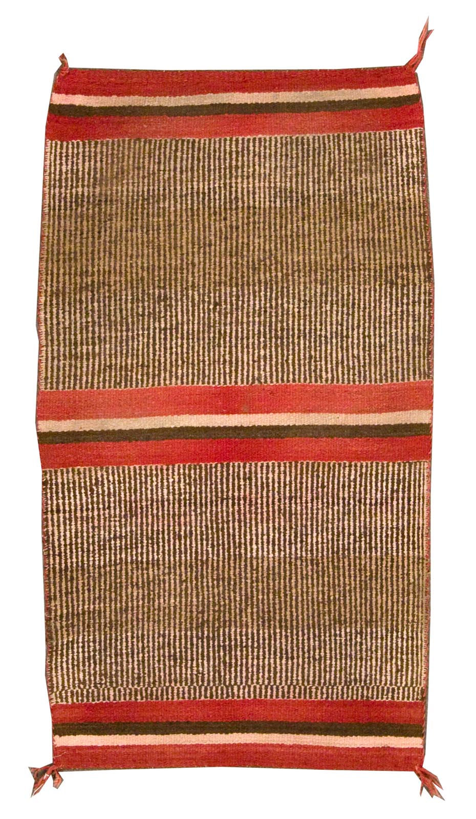 DESCRIPTION: A Navajo twill rug is a rare and technically complex weaving distinguished by its diagonal ribbed texture, achieved through a twill weave rather than the typical tapestry weave. These rugs often feature bold geometric forms or stepped patterns, with the twill technique adding depth and movement to the design. Woven primarily in natural wool tones, such as ivory, brown, and gray, they are prized for their craftsmanship and unique place within the broader Navajo weaving tradition.