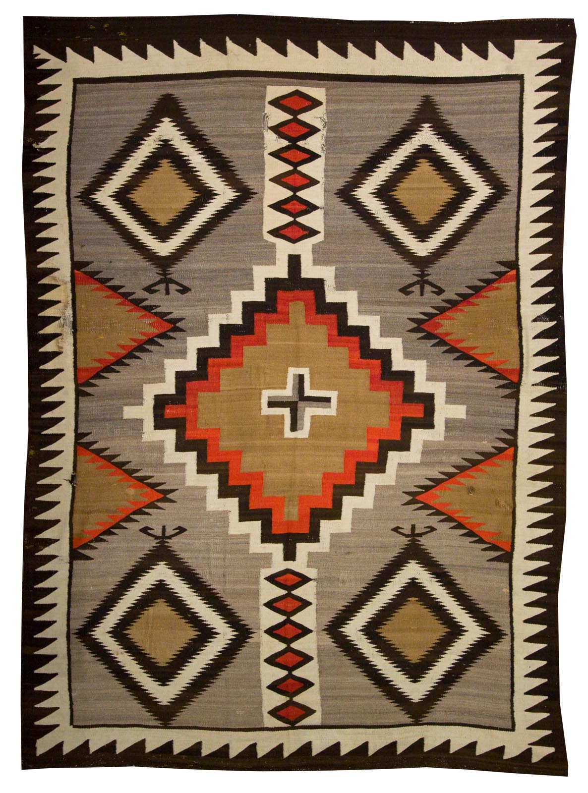 DESCRIPTION: Originating from the Klagetoh region in Arizona, these rugs are closely related to the Two Grey Hills style but are typically defined by a central diamond motif surrounded by stepped and serrated patterns. The color palette usually includes rich grays, warm browns, black, and creamy white, all from undyed, handspun wool. Antique Klagetoh rugs are celebrated for their balanced compositions, tight weaves, and deep connection to Navajo weaving traditions, making them highly collectible and visually striking.