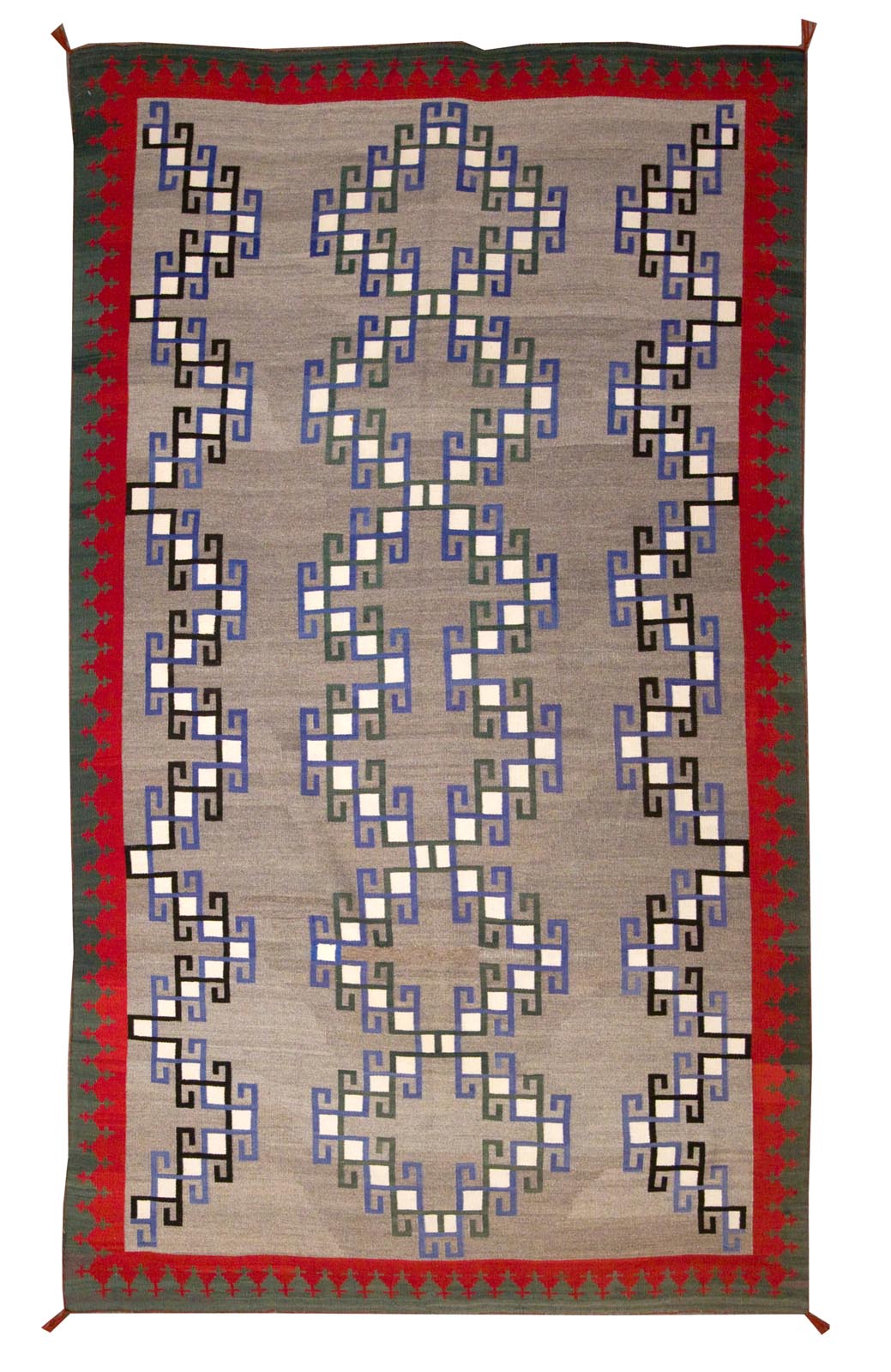 DESCRIPTION: Teec Nos Pos Navajo rugs are known for their bold, intricate patterns and vibrant color palette, often considered among the most detailed of Navajo weavings. These rugs typically feature elaborate central medallions, stepped motifs, and layered borders filled with fine geometric elements. They often have rich reds, deep blues, greens, and creams that dominate the design, reflecting both regional style and early 20th-century trade influences.