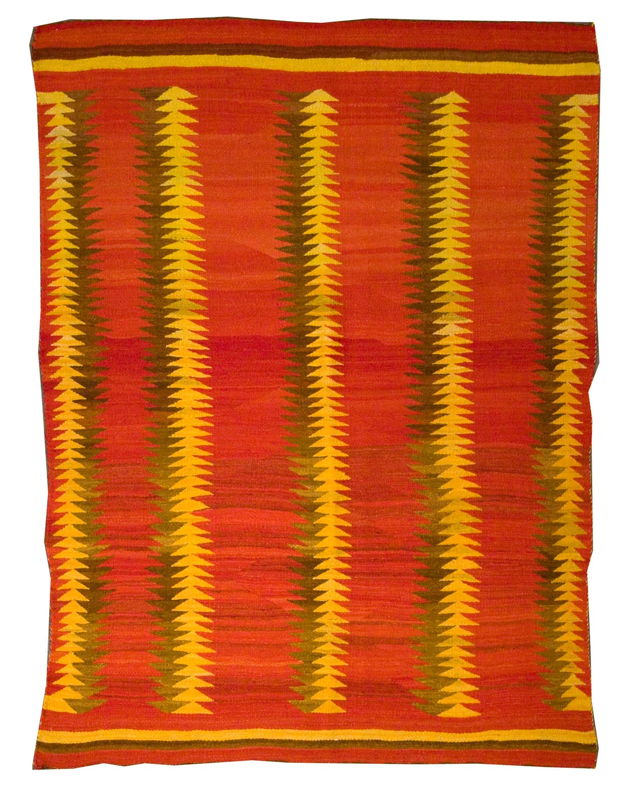 DESCRIPTION: Transitional Navajo rugs, woven from the 1880s to early 1900s, mark the shift from wearable blankets to floor rugs made for trade. These pieces often blend traditional banded or diamond patterns with new bordered formats, and show experimentation with layout, symmetry, and negative space. Colors typically include natural wool tones like ivory, gray, and brown, along with an emerging use of aniline dyes in reds, pinks, indigos, and greens, reflecting both innovation and cultural continuity.