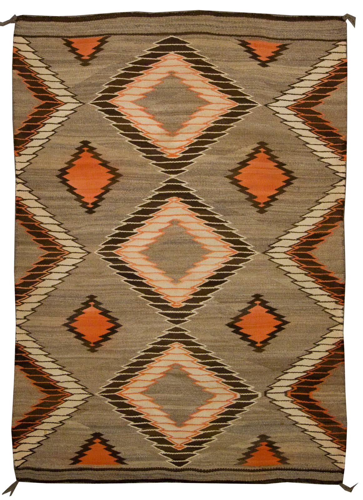 DESCRIPTION: The Native American Crystal rug originates from the Navajo weaving tradition and is named after the Crystal Trading Post in New Mexico. These rugs are known for their balanced geometric patterns, often featuring diamonds, stepped motifs, and muted earth tones like gray, brown, and ivory. Woven with hand-dyed wool, Crystal rugs reflect both the artistry and resourcefulness of Navajo weavers, blending traditional symbolism with regional influences.