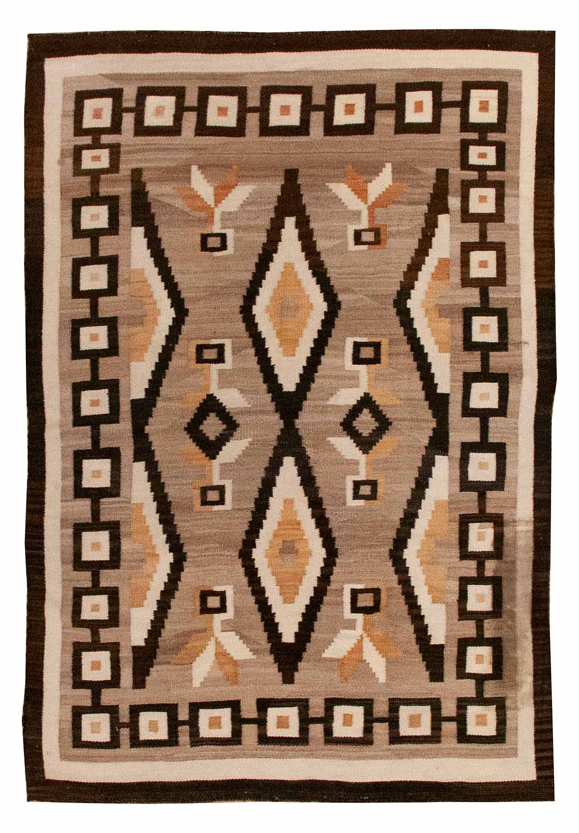 DESCRIPTION: Two Grey Hills Navajo rugs are renowned for their fine handspun wool, tight weave, and elegant use of natural, undyed colors. These rugs often feature complex diamond-based patterns set within stepped and geometric borders, all in a subtle palette of browns, grays, ivory, and black. Reflecting masterful craftsmanship from the Two Grey Hills region, they are celebrated for their balance, precision, and understated beauty.