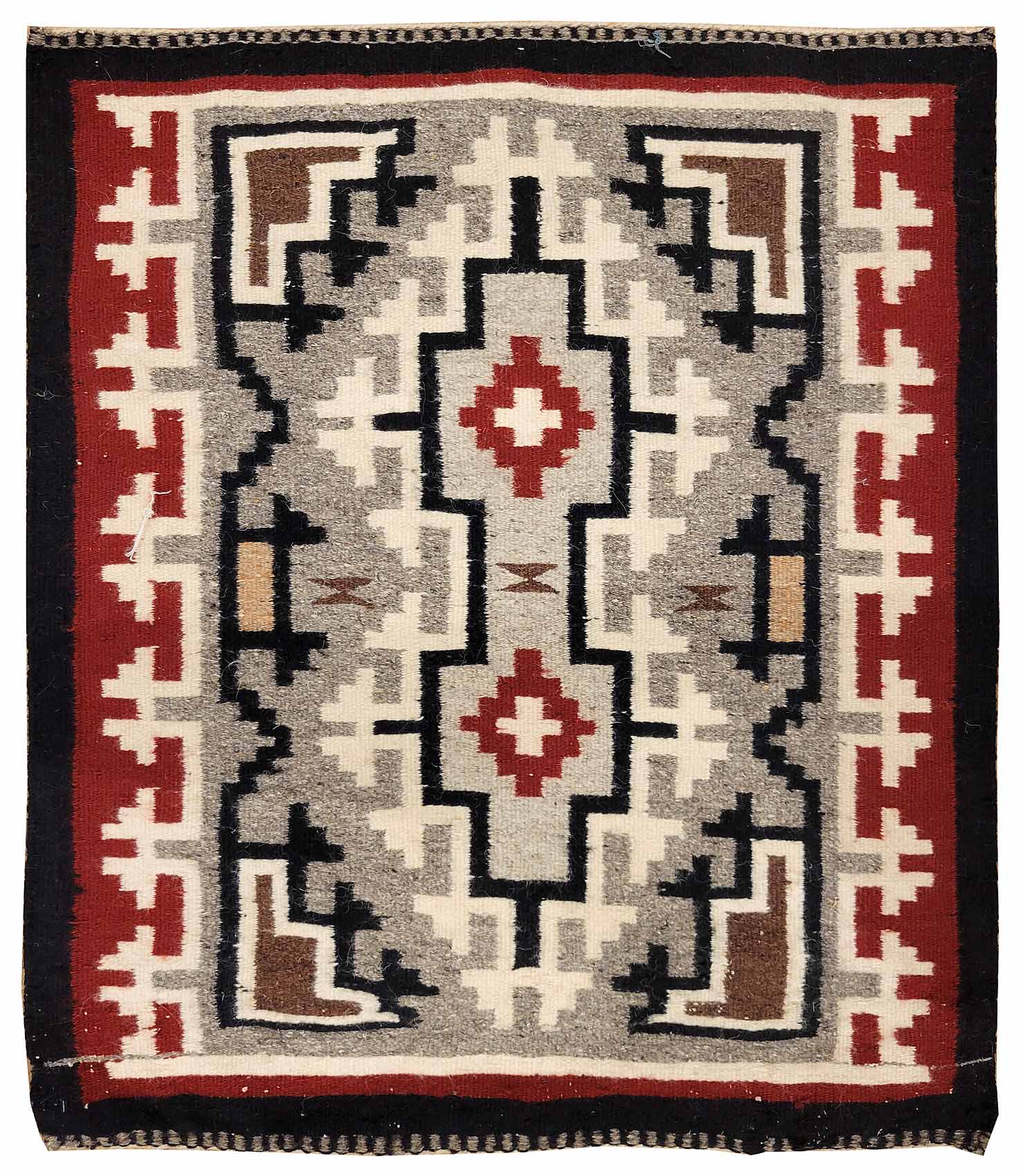 DESCRIPTION: Two Grey Hills Navajo rugs are renowned for their fine handspun wool, tight weave, and elegant use of natural, undyed colors. These rugs often feature complex diamond-based patterns set within stepped and geometric borders, all in a subtle palette of browns, grays, ivory, and black. Reflecting masterful craftsmanship from the Two Grey Hills region, they are celebrated for their balance, precision, and understated beauty.