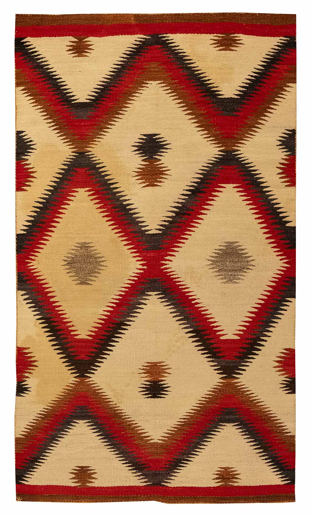 DESCRIPTION: Navajo Eye Dazzler rugs are vibrant and visually striking, first emerging in the late 19th century when Navajo weavers began using brightly colored commercial yarns. These rugs are known for their bold, repetitive patterns, often zigzags, diamonds, and serrated motifs that create an almost optical illusion, hence the name "Eye Dazzler." Unlike earlier Navajo weavings, Eye Dazzlers embrace vivid reds, greens, yellows, and blues, showcasing the weavers' creativity and dynamic design sense. They represent a spirited shift in Navajo artistry and remain highly collectible for their energy, color, and craftsmanship.