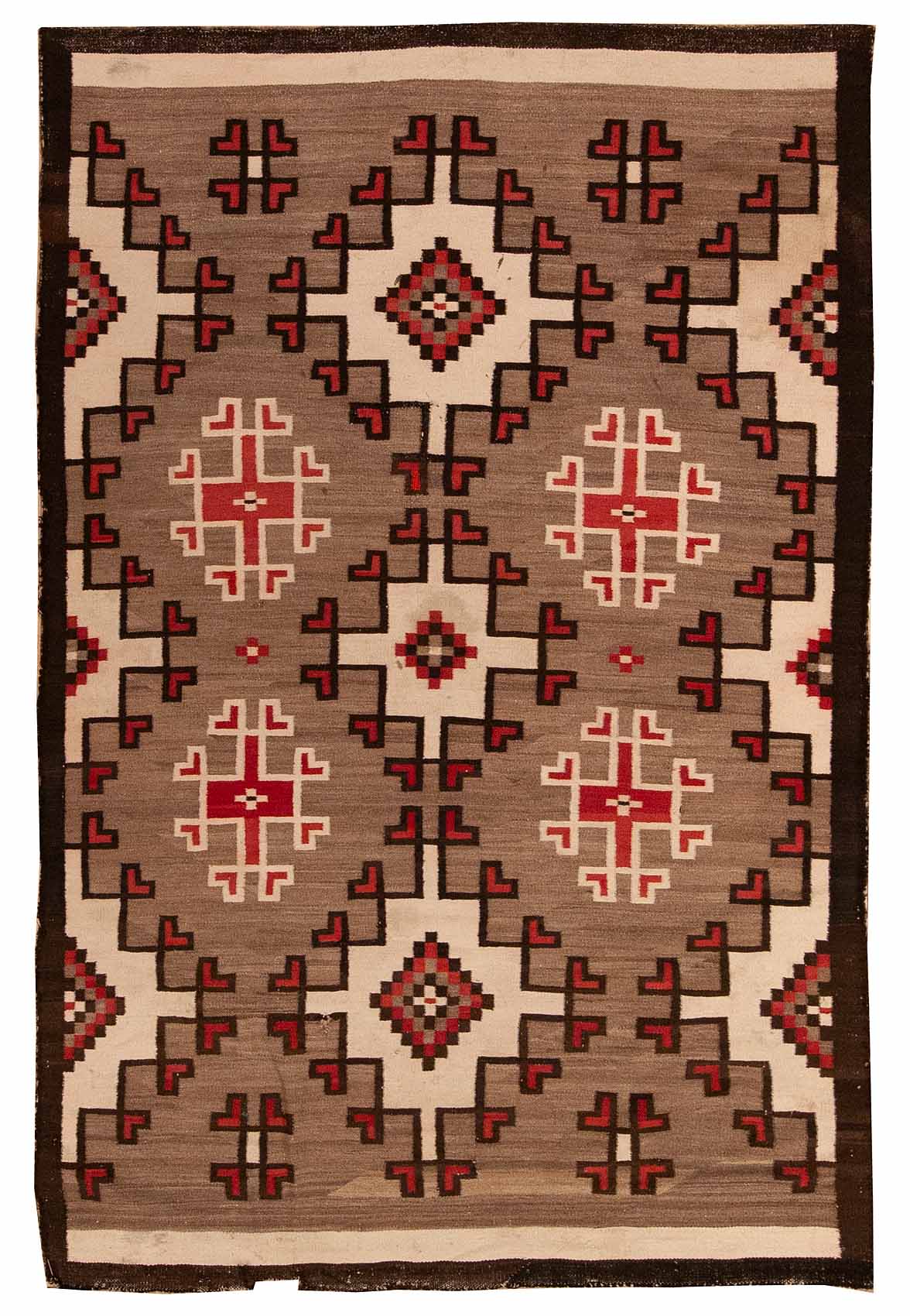 DESCRIPTION: Klagetoh Navajo rugs are closely related to the Ganado style but distinguished by their gray or taupe background, which sets off bold central diamond motifs in red, black, and white. These rugs feature strong geometric symmetry and often include stepped or hooked borders that frame the central design. Woven with handspun wool and exceptional balance, Klagetoh rugs reflect the skilled artistry and regional identity of the Klagetoh weaving tradition.