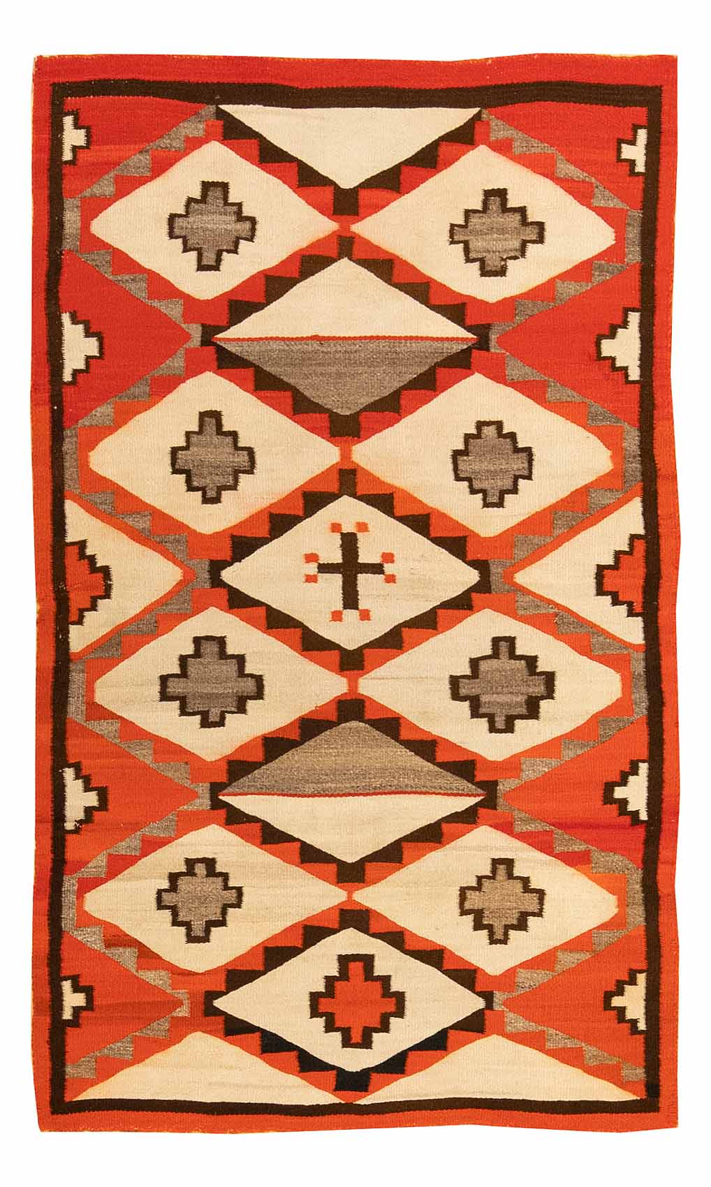 DESCRIPTION: Transitional Navajo rugs, woven from the 1880s to early 1900s, mark the shift from wearable blankets to floor rugs made for trade. These pieces often blend traditional banded or diamond patterns with new bordered formats, and show experimentation with layout, symmetry, and negative space. Colors typically include natural wool tones like ivory, gray, and brown, along with an emerging use of aniline dyes in reds, pinks, indigos, and greens, reflecting both innovation and cultural continuity.
