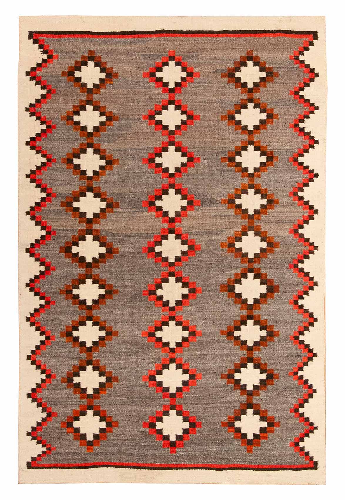 DESCRIPTION: The Native American Crystal rug originates from the Navajo weaving tradition and is named after the Crystal Trading Post in New Mexico. These rugs are known for their balanced geometric patterns, often featuring diamonds, stepped motifs, and muted earth tones like gray, brown, and ivory. Woven with hand-dyed wool, Crystal rugs reflect both the artistry and resourcefulness of Navajo weavers, blending traditional symbolism with regional influences.