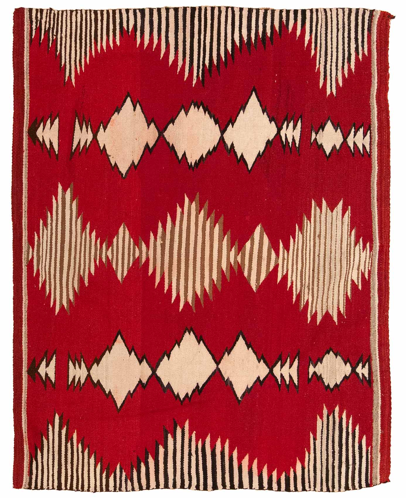 DESCRIPTION: A Red Mesa Navajo rug is known for its vibrant colors, crisp geometry, and bold use of serrated diamond and stepped motifs, often arranged in a dynamic, eye-catching layout. These rugs frequently feature bright reds, oranges, blacks, and whites, sometimes with added yellows or greens, thanks to the use of aniline dyes introduced in the late 19th century. Originating from the Red Mesa region near the Arizona–New Mexico border, they reflect a striking fusion of traditional Navajo design with the vivid color palettes influenced by early trading post aesthetics.
