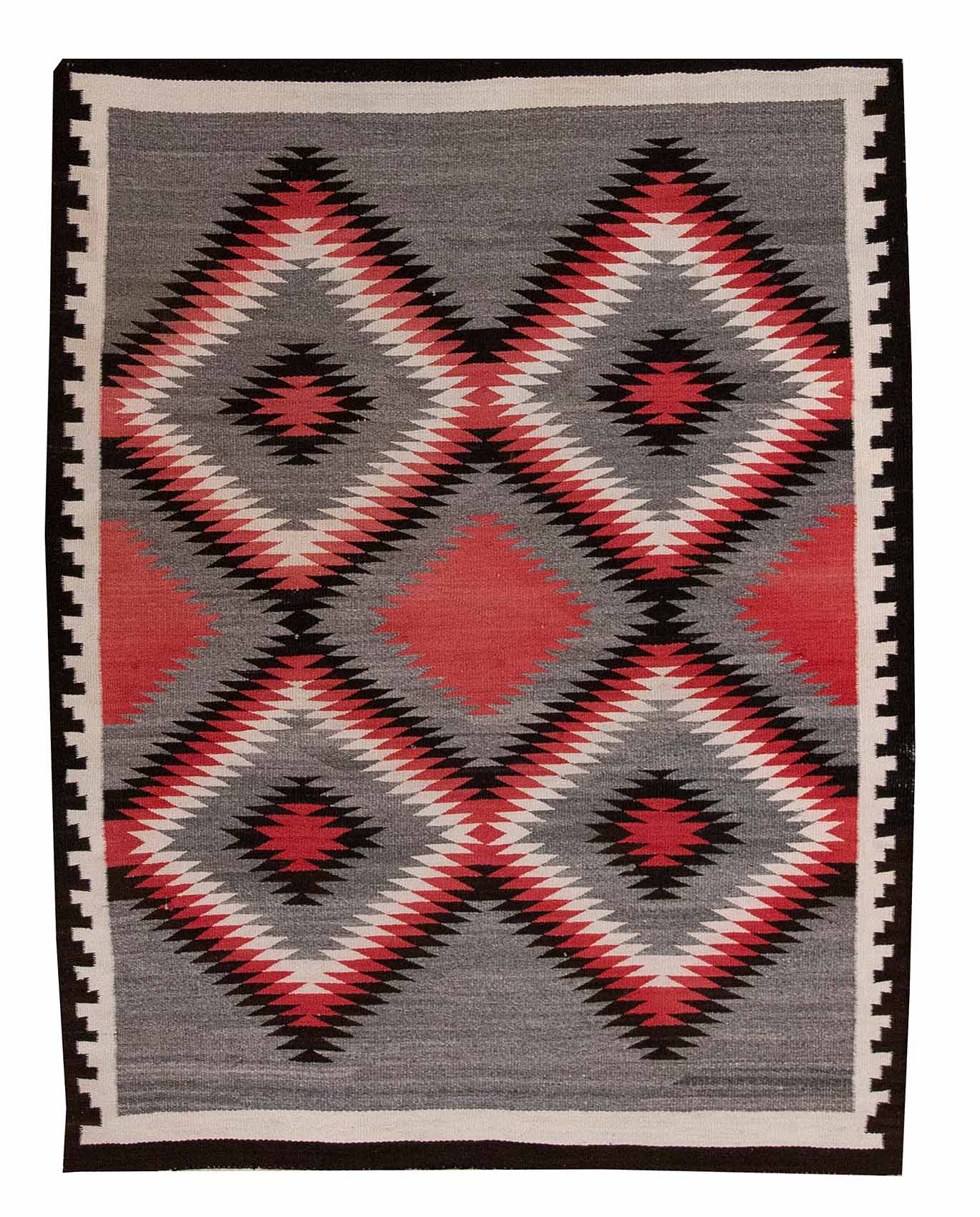 DESCRIPTION: Navajo Eye Dazzler rugs are vibrant and visually striking, first emerging in the late 19th century when Navajo weavers began using brightly colored commercial yarns. These rugs are known for their bold, repetitive patterns, often zigzags, diamonds, and serrated motifs that create an almost optical illusion, hence the name "Eye Dazzler." Unlike earlier Navajo weavings, Eye Dazzlers embrace vivid reds, greens, yellows, and blues, showcasing the weavers' creativity and dynamic design sense. They represent a spirited shift in Navajo artistry and remain highly collectible for their energy, color, and craftsmanship.
