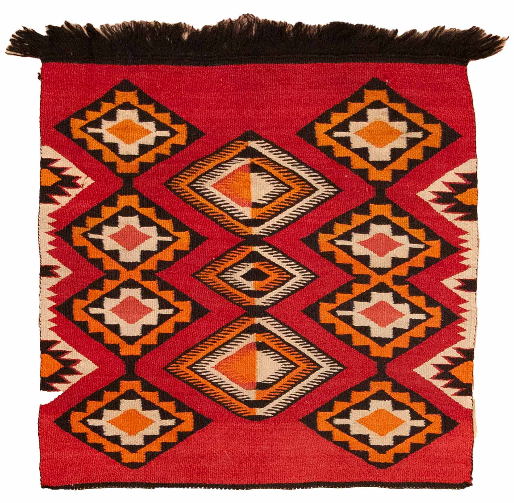 DESCRIPTION: A Germantown Navajo rug is a vibrant and finely woven textile made using commercially dyed wool yarns produced in Germantown, Pennsylvania, and supplied to Navajo weavers in the late 19th century. These rugs are known for their bright, saturated colors, such as magenta, turquoise, and chartreuse, and complex, often experimental designs including serrated diamonds, zigzags, and stepped patterns. Woven during a time of great transition and adaptation, Germantown rugs represent a unique moment in Navajo weaving history, blending traditional artistry with newly available materials.