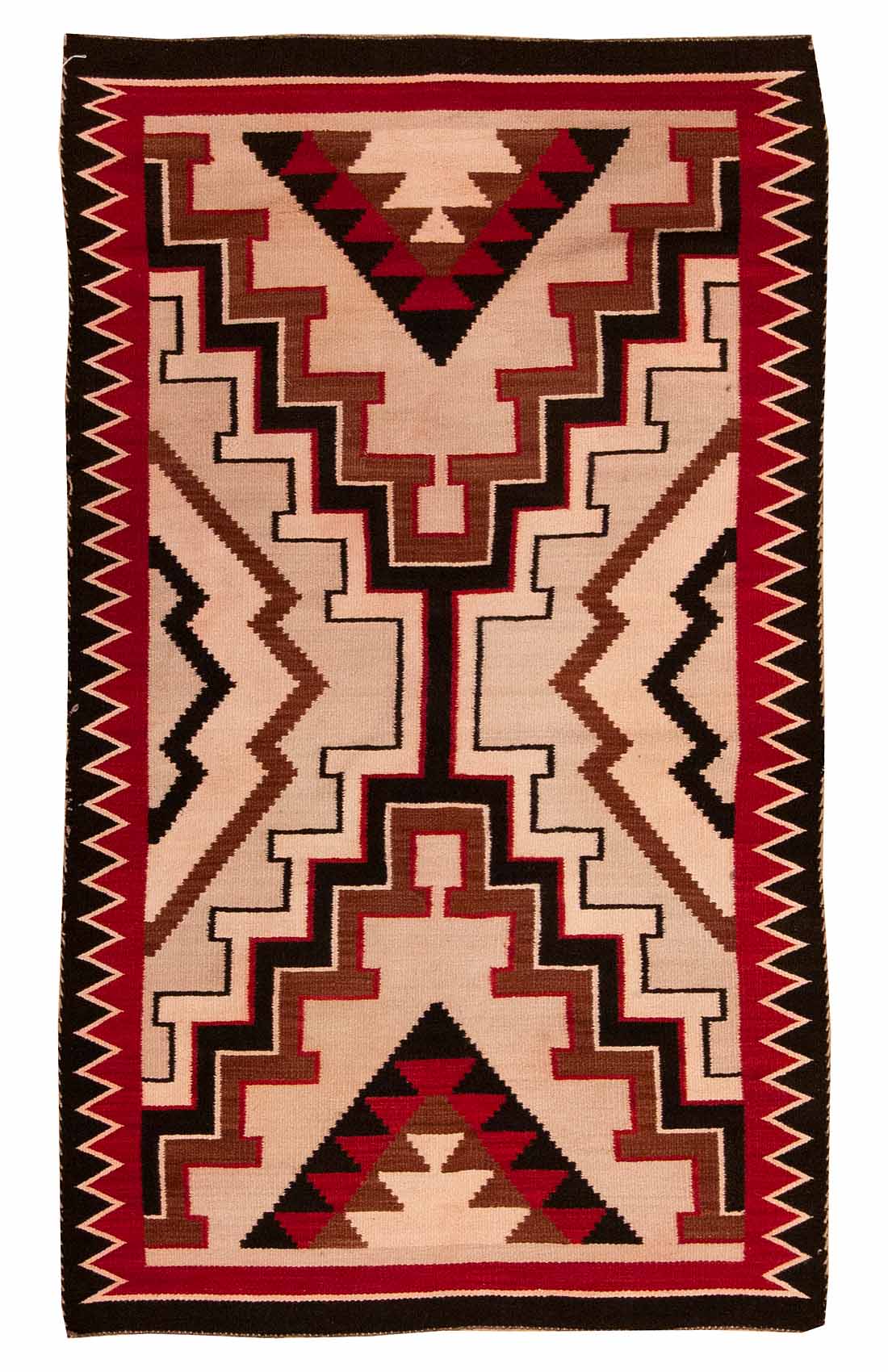 DESCRIPTION: Storm Pattern Navajo rugs are a powerful design rooted in symbolic meaning, often representing the four cardinal directions and the interconnectedness of the natural world. Its layout typically features a central diamond or rectangle connected by zigzag lines to corner motifs, creating a dynamic sense of movement and balance. Woven in earthy tones, black, white, and deep reds or blues, these rugs blend spiritual symbolism with striking visual geometry.